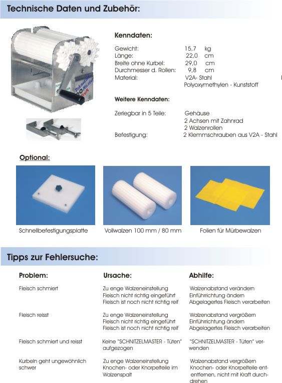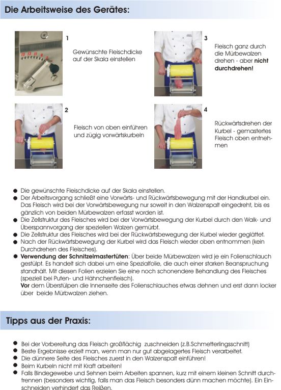 - Brand new SCHNITZELMASTER Bags: These covers are made of a special plastic foil and are simly pulled over the tenderising rollers. They guarantee an even gentler and more sterile treatment of the meat.